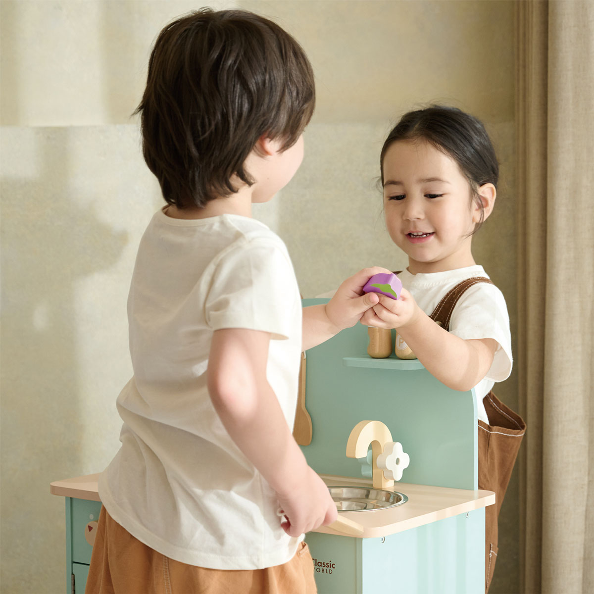 This charming kitchen set provides an ideal environment for your young chef to explore culinary skills. Complete with a sink, stove, microwave, oven, cupboard, and more, it offers opportunities for activities such as washing fruit, chopping vegetables, cooking, and seasoning. Through imaginative role play, children can cultivate their creativity and develop new skills.