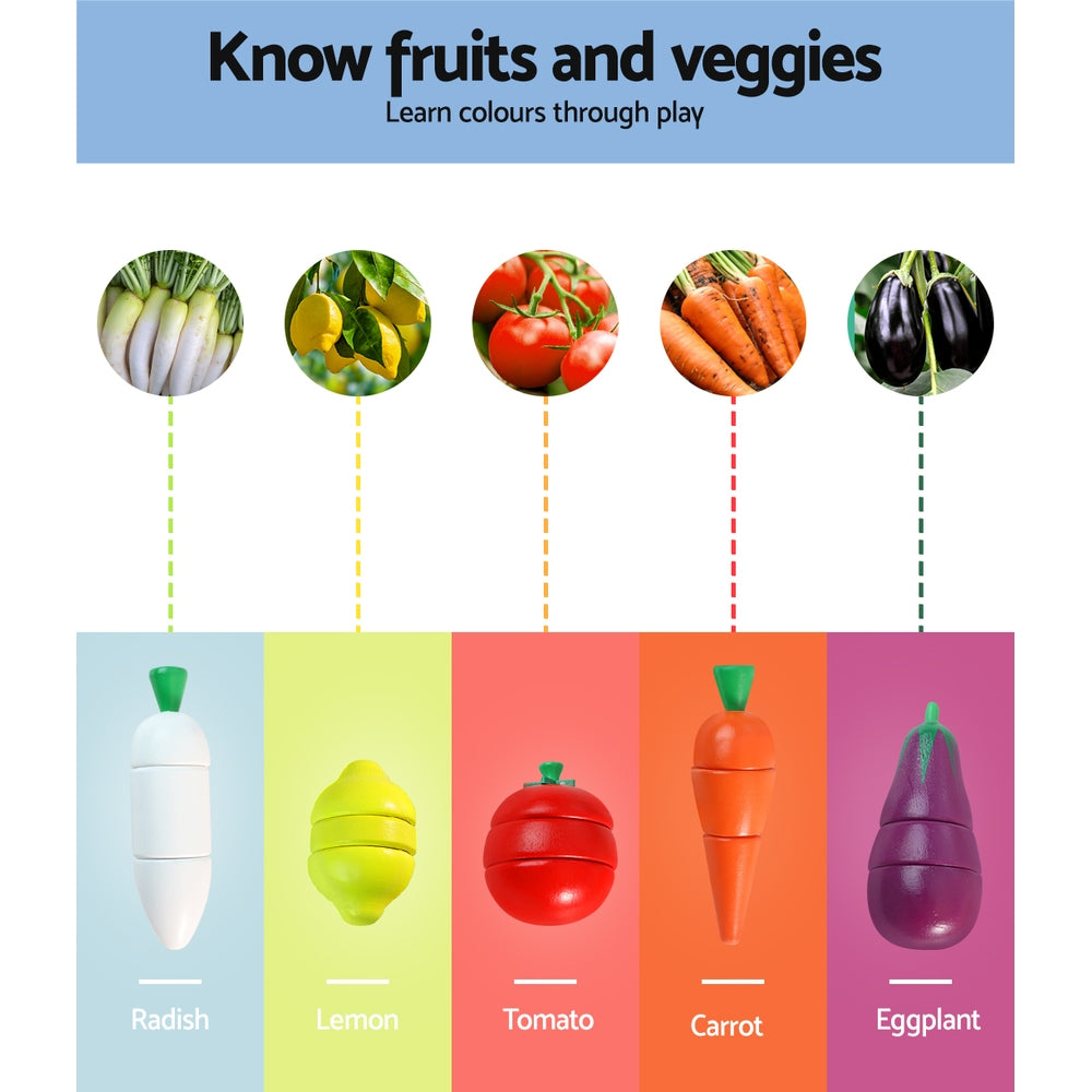Introducing an engaging way for children aged three and above to develop essential life skills through imaginative play. The Keezi Kids Kitchen Play Set offers a thoughtfully designed 29-piece collection featuring colourful fruits, vegetables, and kitchen utensils. With magnetic "cut" pieces enabling realistic slicing and effortless reassembly, children can explore cooking, table setting, and tidying up in a safe and stimulating environment. Crafted from sturdy solid wood and finished with non-toxic, lead-free paint, this playset encourages creativity and cognitive growth. An ideal gift that combines learning and enjoyment, nurturing young minds with every session.